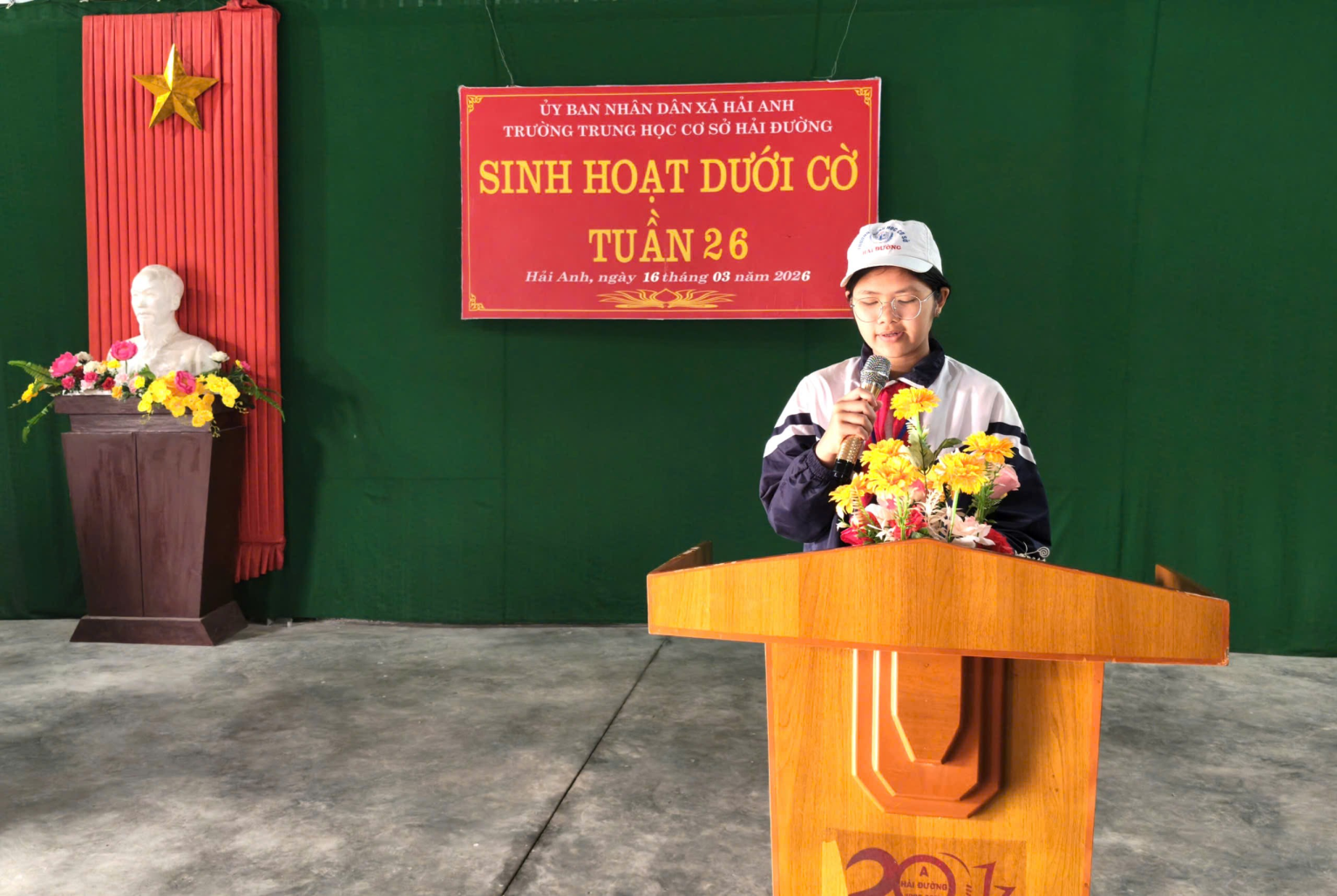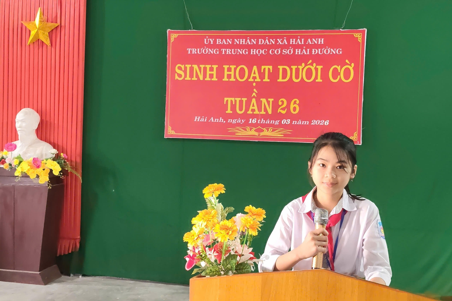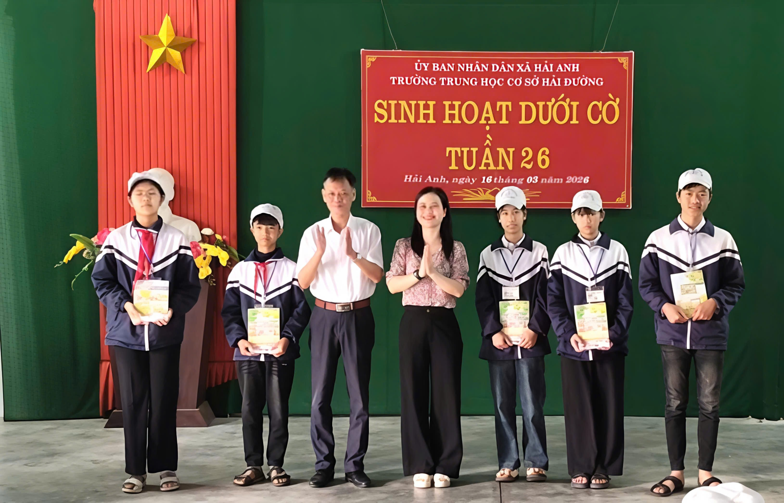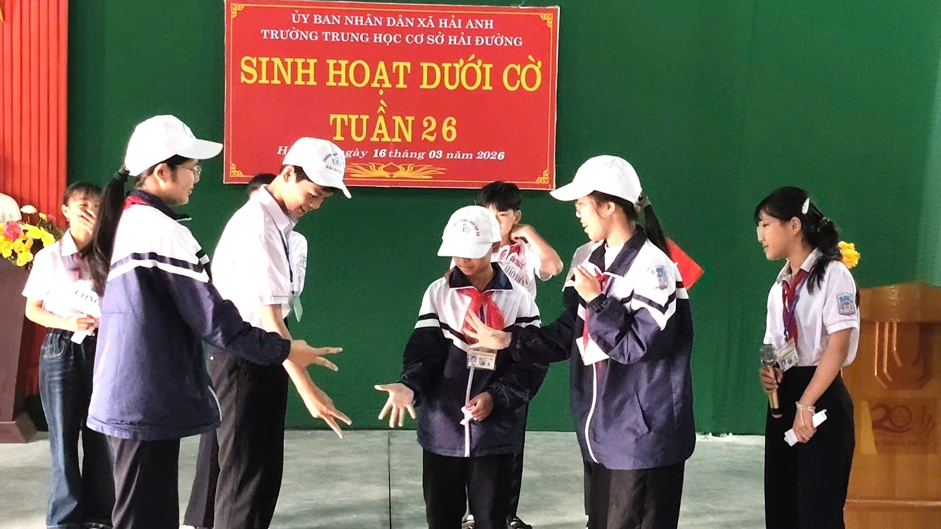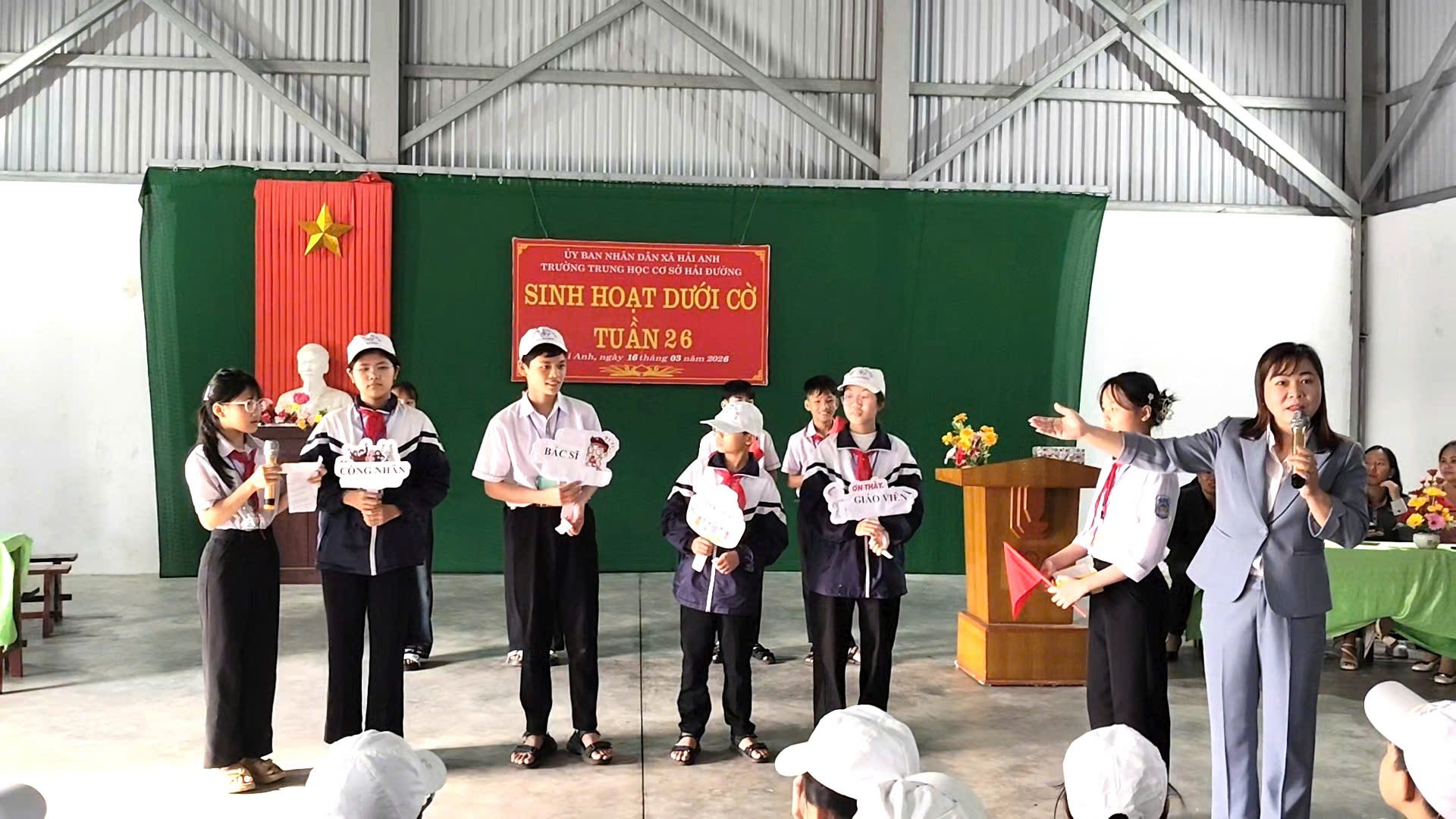 Sáng thứ Hai đầu tuần, trong không khí trang nghiêm và phấn khởi, thầy và trò trường THCS Hải Đường đã tổ chức buổi sinh hoạt dưới cờ với nhiều nội dung ý nghĩa. Trường THCS Hải Đường gồm hai khu: Khu A và Khu B. Cả hai khu đều tổ chức sinh hoạt dưới cờ rất sôi nổi. Chương trình không chỉ là dịp để nhìn lại kết quả học tập, rèn luyện của tuần qua, mang đến một hoạt động truyền thông thú vị về chủ đề “Các ngành nghề trong xã hội”, giúp học sinh hiểu hơn về giá trị của lao động và nuôi dưỡng ước mơ nghề nghiệp cho tương lai mà còn để chúc mừng sự thành công tốt đẹp sau ngày Bầu cử đại biểu Quốc hội khóa XVI và Đại biểu hội đồng nhân dân các cấp nhiệm kỳ 2026-2031. Tại khu A, thầy và trò đã tổ chức buổi sinh hoạt đầy hứng khởi, mang lại niềm vui, gieo mầm ước mơ nghề nghiệp cho học sinh, tạo động lực cho học sinh quyết tâm phấn đấu.