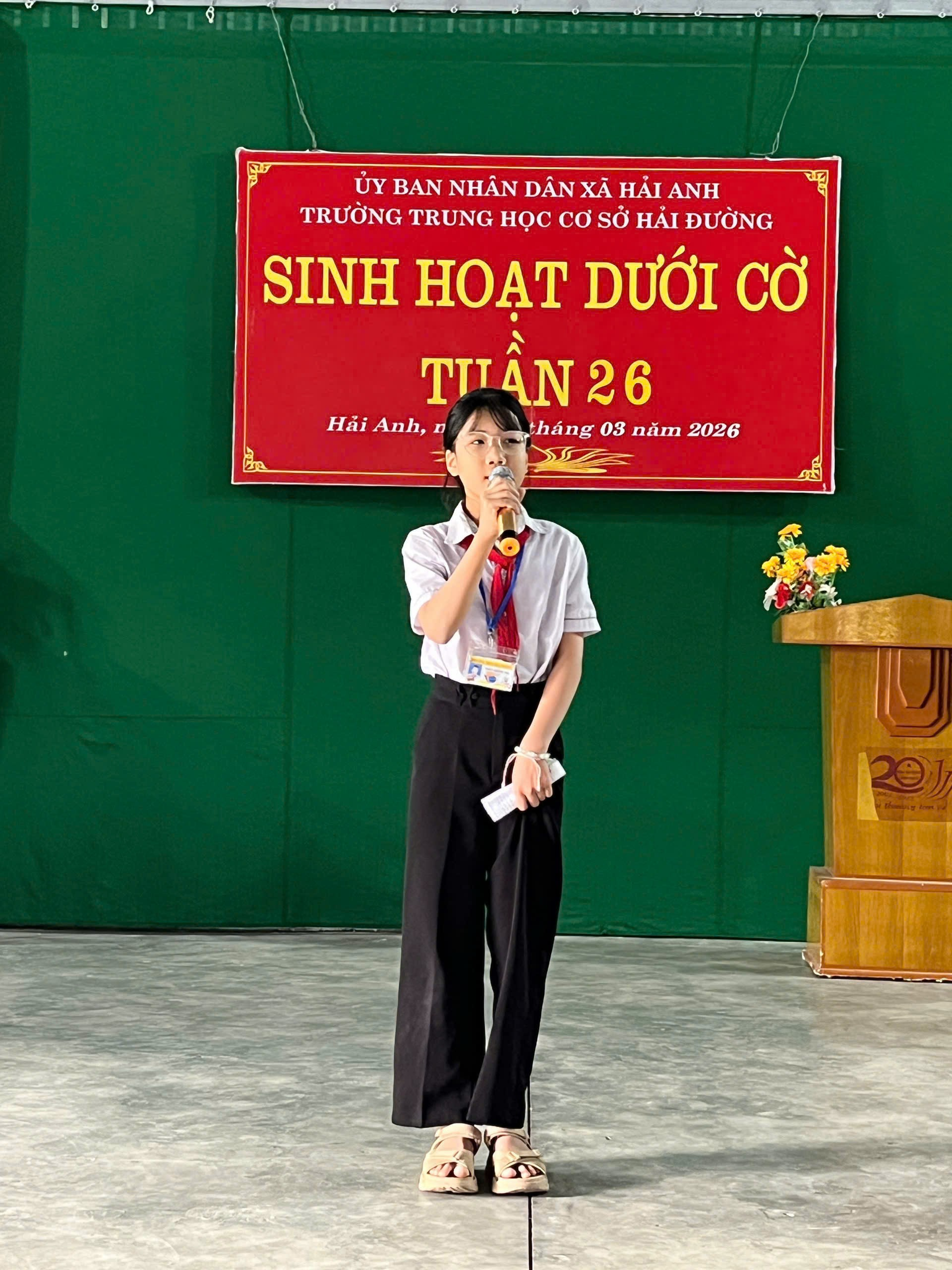 Sau nghi thức chào cờ, bạn Đỗ Thị Thanh Ngân – học sinh lớp 7A1, đại diện lớp trực tuần đã lên nhận xét, đánh giá tình hình học tập và nề nếp của toàn trường trong tuần học vừa qua.Trong phần nhận xét, bạn đã nêu rõ những kết quả đáng khích lệ như: nhiều lớp duy trì tốt nề nếp học tập, học sinh chấp hành nghiêm túc nội quy trường lớp, các hoạt động học tập và phong trào diễn ra sôi nổi. Bên cạnh đó, bạn cũng nhắc nhở một số điểm cần khắc phục để tuần học tiếp theo đạt kết quả tốt hơn.Kết thúc phần nhận xét, bạn Đỗ Thị Thanh Ngân đã thay mặt lớp 7A1 bàn giao nhiệm vụ trực tuần cho lớp 7A2 với lời chúc lớp bạn sẽ hoàn thành tốt nhiệm vụ trong tuần mới.